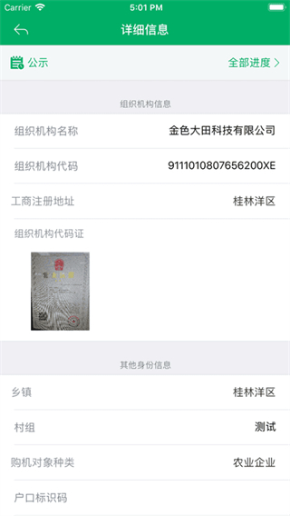 4、点击补贴公示中某条信息的详情按钮,查看申请人的地区机具信息购机数量价格及补贴金额等详细内容。