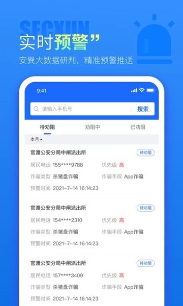 4、依托专业大数据系统进行实时风险研判,一旦发现民众可能遭遇诈骗,即通过应用推送精准预警信息,实现主动防御。