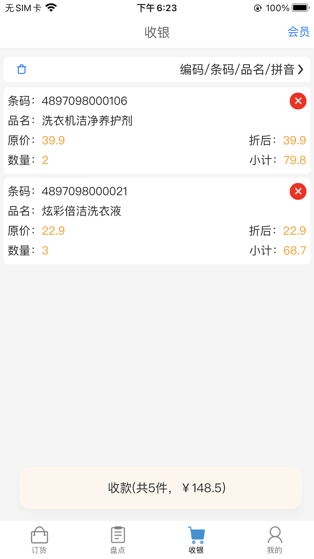 3、输入条码查找商品,也能点击扫码按钮,通过扫描商品条码快速获取商品信息,添加商品到收银列表。