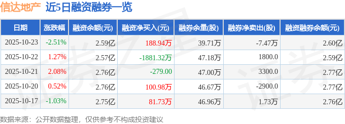 证券之星消息,截至2025年10月23日收盘,信达地产(600657)报收于3.88元,下跌2.51%,换手率1.08%,成交量30.86万手,成交额1.2亿元。