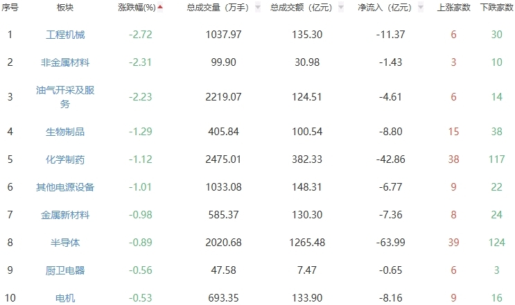 板块方面,煤炭开采加工、能源金属、影视院线等板块涨幅居前,工程机械、非金属材料、油气开采及服务等板块跌幅居前。