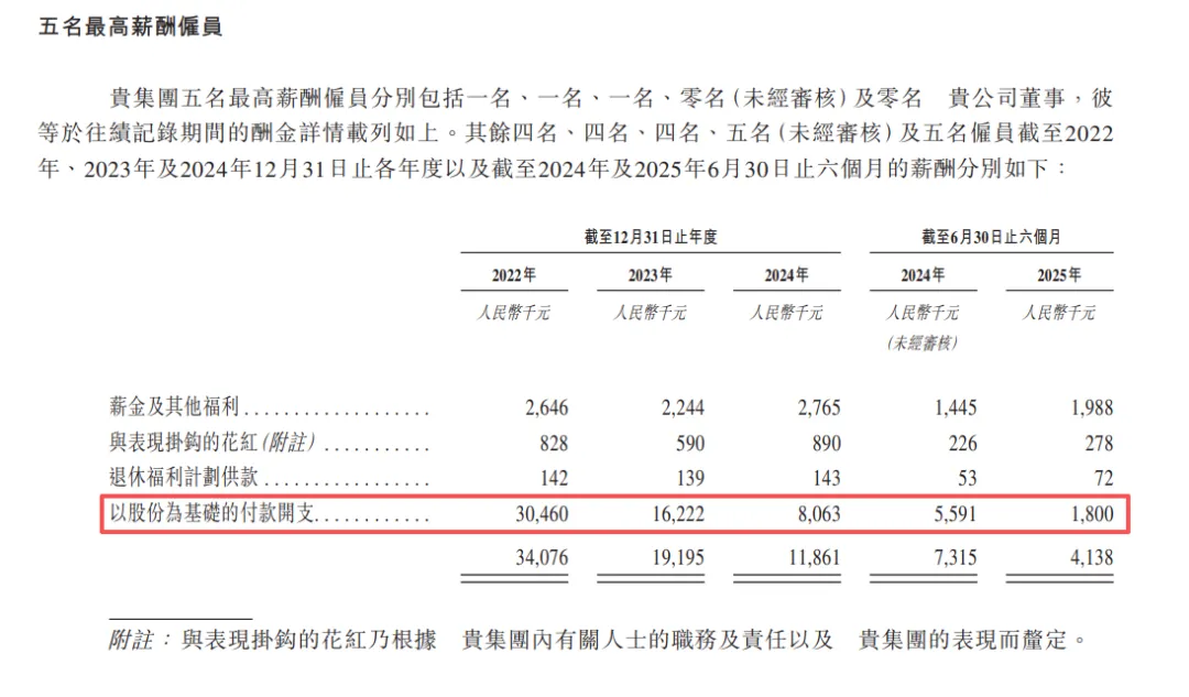 五名最高薪酬雇员的薪酬分别为3407.6万元、1919.5万元、1186.1万元及413.8万元,远超同期董事薪酬;其中,以股份为基础的付款开支3046万元、1622.2万元、806.3万元及180万元。算下来,前述雇员人均年薪(含股份支付)高达681.52万元、383.9万元、237.22万元及82.76万元。