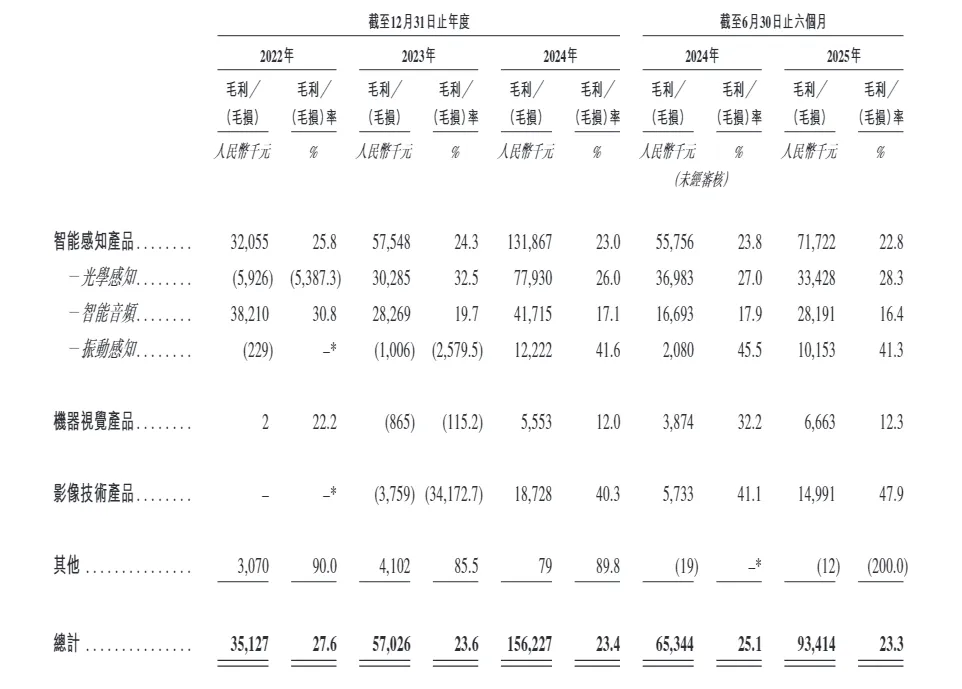 不过,智能感知产品的收入虽快速增长,但毛利率持续下滑。报告期内,该产品的毛利率分别为25.8%、24.3%、23%及22.8%(YOY-1.8%)。