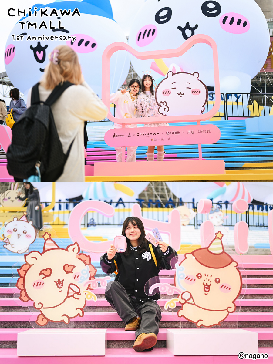 作为地面场景的核心,东方明珠城市广场以三位主角为视觉主体,布局多组打卡装置与品牌展区,入口处设计为吉伊卡哇、哈奇喵与乌萨奇的耳朵造型门头,并搭配融合IP形象与东方明珠、游船元素的主题点位。广场楼梯采用粉、蓝、黄三色主题色装饰,沿途设置的互动打卡点吸引大量游客驻足参与,完成指定任务即可获赠活动限定主题周边,让观众深度沉浸IP氛围。