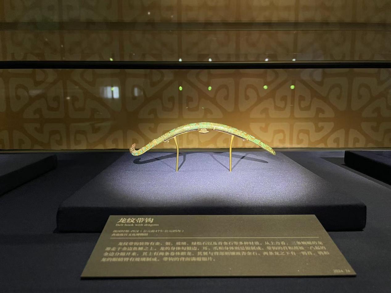 展品类型涵盖首饰、腰带饰件、车马饰、礼仪用具等,造型各异、工艺精湛。其中,公元前15世纪-13世纪的喇叭口金饰,见证了黄金工艺从欧亚大陆西端向东传的轨迹;战国至汉代的卷曲动物纹饰牌,呈现了草原游牧民族独特的“动物纹”艺术风格;唐代金饰则展现了丝绸之路多元文化交融的华丽风采;而辽宋时期的金带钩与头饰,则体现了中原与北方草原文化的深度融合。