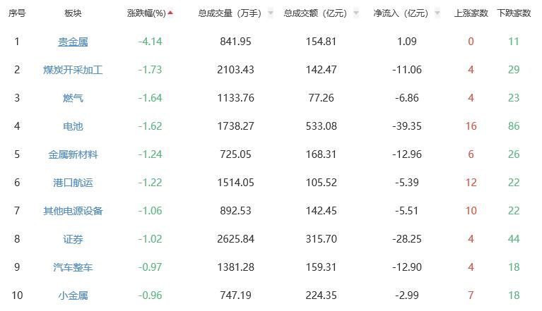 板块方面,油气开采及服务、工程机械、风电设备、房地产等涨幅居前,贵金属、煤炭开采加工、燃气、电池等跌幅居前。