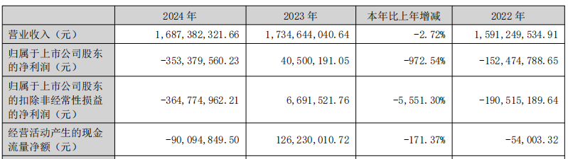 2024年,公司实现营业收入16.87亿元,同比下降2.72%;归属于上市公司股东的净利润-3.53亿元,上年同期为4050.02万元;归属于上市公司股东的扣除非经常性损益的净利润-3.65亿元,上年同期为669.15万元;经营活动产生的现金流量净额-9009.48万元,上年同期为1.26亿元。