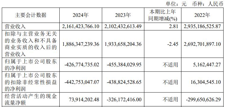 2024年,公司实现营业收入21.61亿元,同比增长2.81%;归属于上市公司股东的净利润-4.27亿元,上年同期为-4.55亿元;归属于上市公司股东的扣非净利润-4.43亿元,上年同期为-4.39亿元;经营活动产生的现金流量净额7391.42万元,上年同期为-3.26亿元。