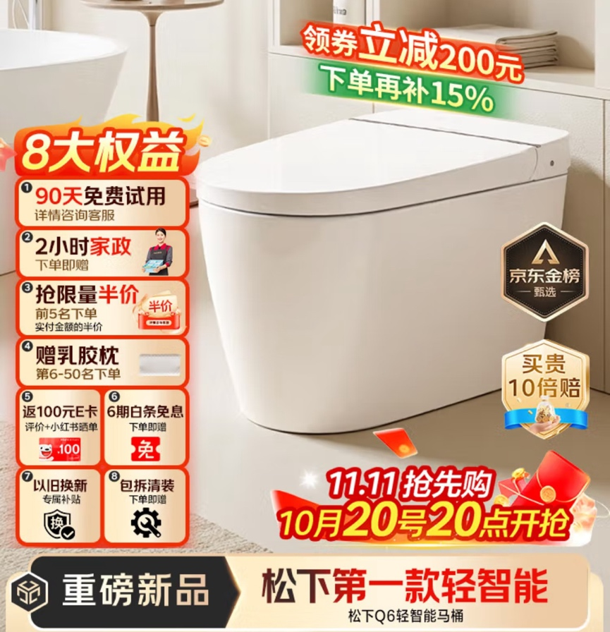 “作为一台马桶,冲不干净就是原罪。”京东采销团队这样形容产品的设计理念。该款松下极简智能马桶定价控制在1999元,首发期间价格低至1699元,并赠送价值1500元的多重好礼。相较市场上同级别国际品牌产品约4000元的售价,性价比优势显著。