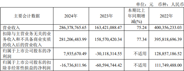 2023年、2024年,公司归属于上市公司股东的净利润分别为-3011.83万元、793.57万元;归属于上市公司股东的扣除非经常性损益的净利润分别为-6059.47万元、-1673.68万元;经营活动产生的现金流量净额分别为-4133.88万元、-746.32万元。