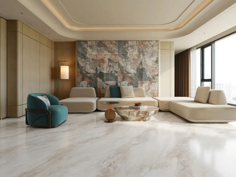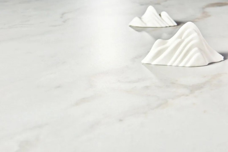 「宋境·玉」运用45°柔拋工艺,让砖面更加接近天然石材的光感,柔光质感更加高级,用在客餐厅、卧室光感非常舒适;叠加了冰晶干粒,光感细节更加丰富精致。