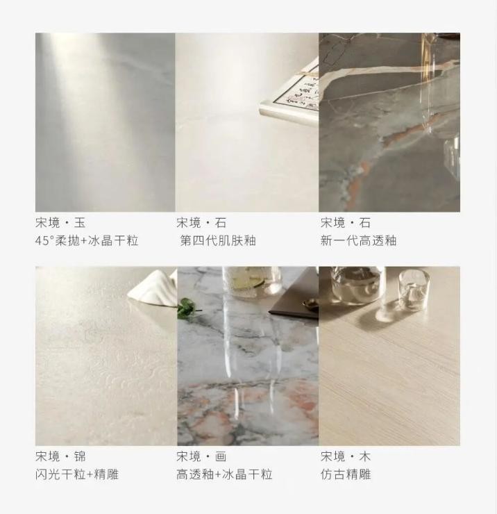 灵感溯源:系列设计题材源于宋代五大名品——玉、石、锦、画、木,将古典风物化为现代砖面纹理。