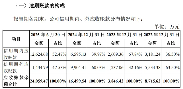 数据显示,祺龙海洋的应收账款余额犹如过山车:2022年至2025年上半年,应收账款余额分别为8715.62万元、3846.42万元、1.65亿元、2.41亿元,其中,信用期内应收账款分别为3181.24万元、2609.36万元、6595.13万元、1.26亿元;占比分别为36.50%、67.84%、39.97%、52.47%;信用期外应收账款分别为5534.38万元、1237.06万元、9904.41万元、1.14亿元,占比分别为63.50%、32.16%、60.03%、47.53%。