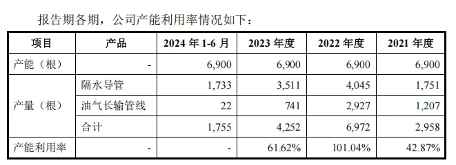 根据披露的信息,祺龙海洋目前面临的核心矛盾是“阶段性产能不足”。其现有的一条制管生产线,需要同时满足隔水导管和油气长输管线两种产品的生产任务。2021年至2023年,这条生产线的产能利用率如同坐过山车,从42.87%飙升至101.04%,又回落至61.62%。这种剧烈波动,根源在于订单的“不均衡性”——时而集中爆发导致超负荷运转,时而清淡导致产能闲置。这种模式下,公司坦言只能“优先保障”利润率更高或更核心的隔水导管业务,致使长输管线业务发展受限。