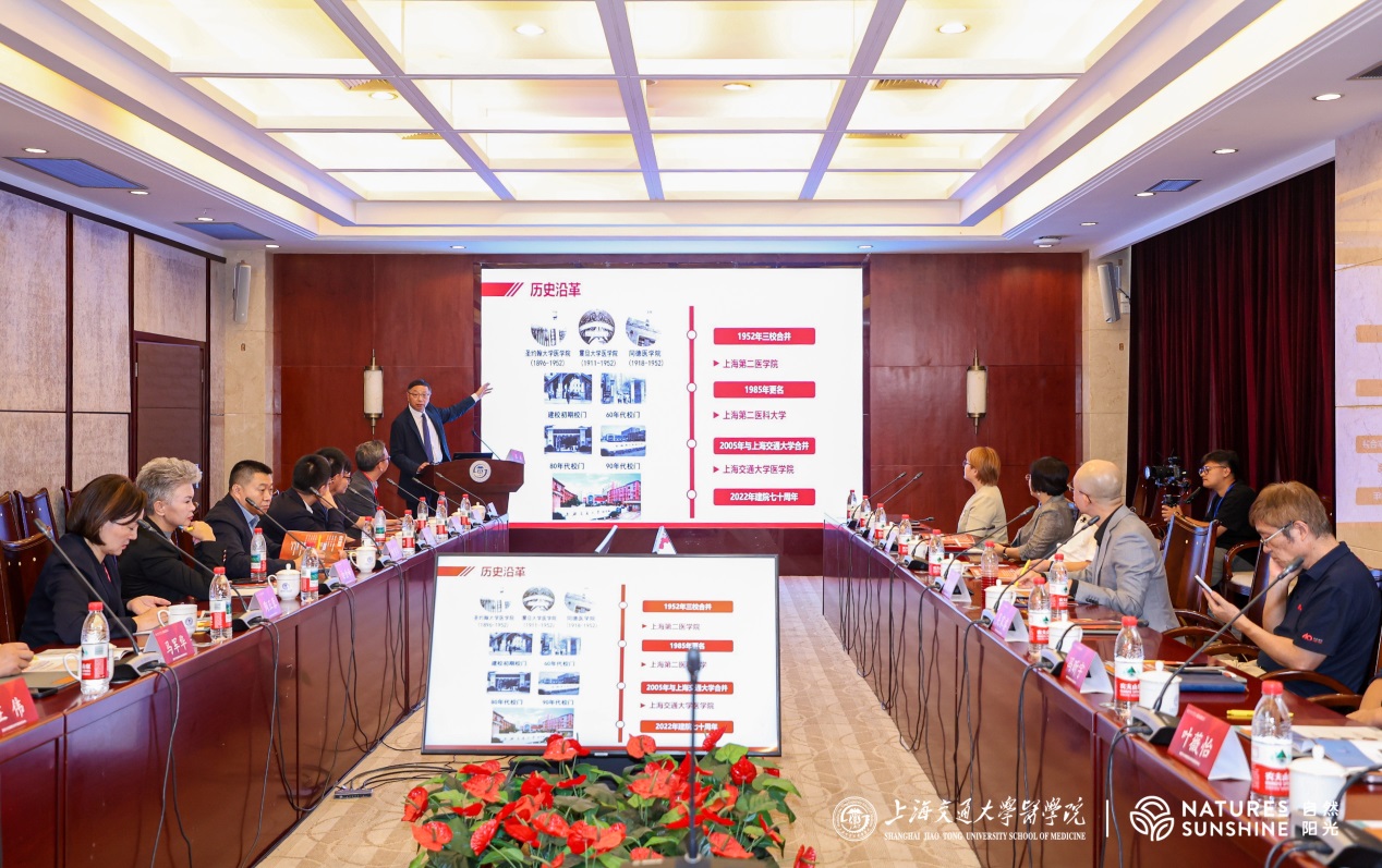 蔡威教授首先对上海交通大学医学院的历史沿革做了详细介绍,生动展现了医学院的发展史。学院始于1896年,由圣约翰、震旦、同德三校一脉传承、夯基垒土,在129年的办学历程中,为我国医疗卫生事业作出了杰出的贡献,大师云集、人才荟萃,现有中国科学院院士6人,中国工程院院士16人,在软科、ESI等全球权威榜单排名中, 上海交通大学医学院临床医学等多门学科稳居全国榜首或前列,科研与学科建设的综合实力持续领跑。一代代交医人始终凝心聚力、敢为人先,为全力创建世界一流的医学院、为服务人民健康接续奋斗。他殷切期望校企双方以智库建设为契机,抚今追昔、知史鉴往,立足本土,发挥各自优势,共同谱写合作新篇章。