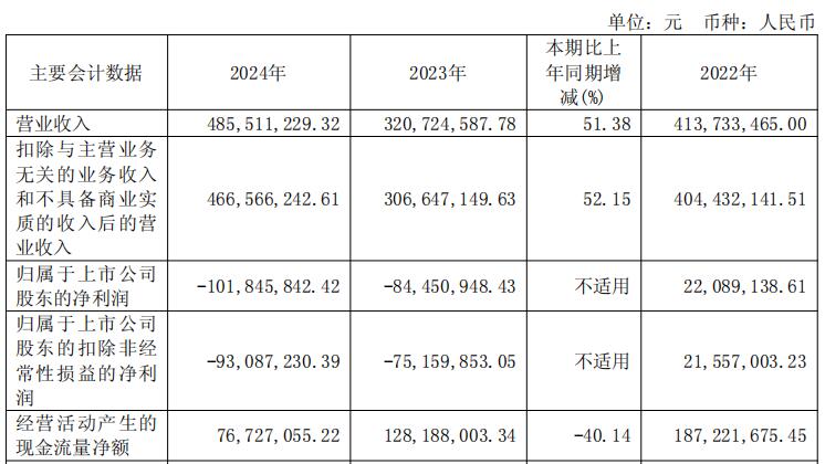 2024年,公司实现营业收入4.86亿元,同比增长51.38%;归属于上市公司股东的净利润-1.02亿元,上年同期为-8445.09万元;归属于上市公司股东的扣除非经常性损益的净利润-9308.72万元,上年同期为-7515.99万元;经营活动产生的现金流量净额7672.71万元,同比减少40.14%。