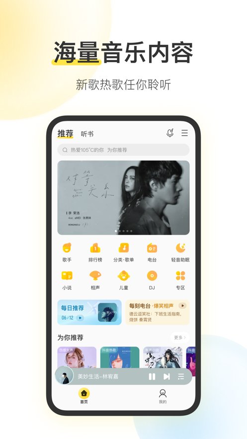 5、基于用户日常听歌习惯进行智能个性推荐,每日推送优质音频内容,高度贴合用户的音乐审美与收听偏好。