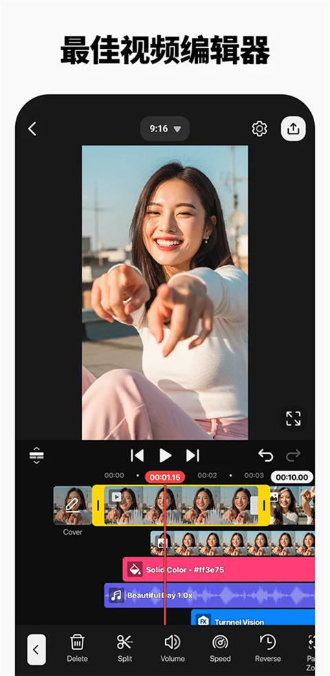 4.提供独立的音轨编辑,可以单独调整每段视频的原声、背景音乐和音效的音量。
