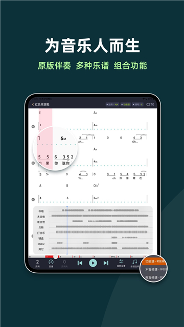 2、所有歌曲均提供专业曲谱显示,以线性乐谱形式呈现四种主流乐器演奏谱,贴合节拍线性展示。