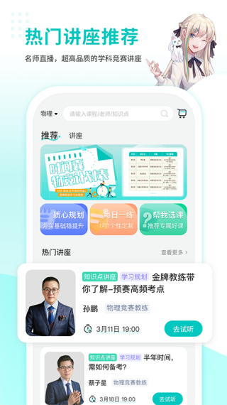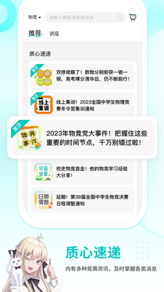 质心在线app官网安卓版是一款专注于中学学科竞赛的在线学习软件。软件提供物理、数学、化学、生物等核心科目的竞赛课程资源。通过直播与录播课程、智能题库以及模拟考试等功能,服务于从入门到冲刺各阶段的学习需求。这里连接了全国的竞赛学习者,旨在帮助使用者系统化地提升竞赛能力。