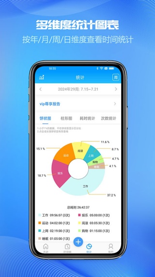 4.时间规划数据会以各种类型统计出来,比如饼状图、柱形图、耗时统计和次数统计。
