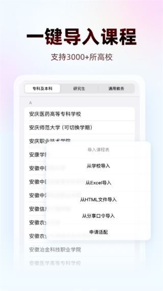 1.课程导入方式非常高效,已专门适配超过3000所高校的教务系统。只需登录学校账号,大约10秒就能将整个学期的课程表同步到应用中,完全节省了手动录入的时间。