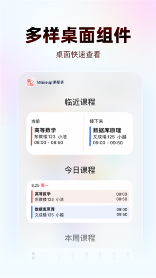 WakeUp课程表官方2026最新版是一款专为高校学生打造的轻量级课程管理工具。这款软件支持从海量高校的教务系统一键导入课程表,省去手动输入的麻烦。除了核心的课表管理,它还整合了强大的拍照搜题功能,覆盖多个学科的海量题库,并能通过桌面小部件快速查看日程。致力于在单一的应用里,提供从课程管理到学业辅助的完整解决方案。