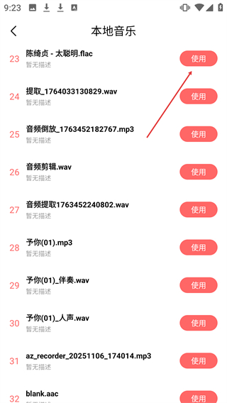 3、在本地音乐页面点击目标音频对应的【使用】按钮,进入音频剪切设置页面。
