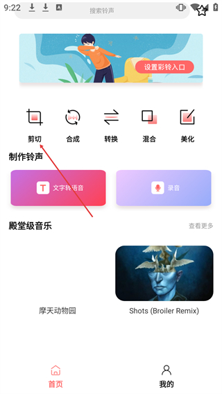 1、在铃声制作应用首页点击【剪切】选项,进入剪切页面。