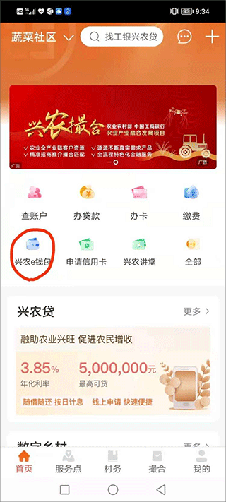 1、进入首页中点击“兴农e钱包”;