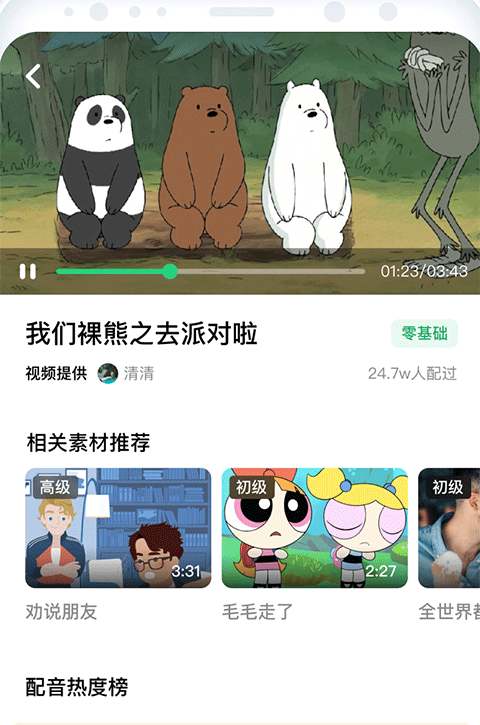3、提供趣味配音课,有着海量的视频提供学习,扮演配音角色,在娱乐的同时增强英语的能力;