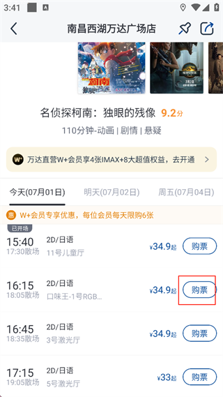 2、找到想要看的电影,选择日期和时间之后,点击购票;