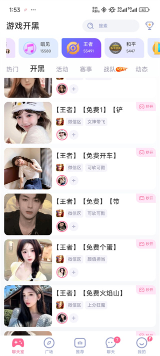 4、不同游戏板块分类清晰,王者、和平精英等热门游戏都能找到合适的队伍和房间。
