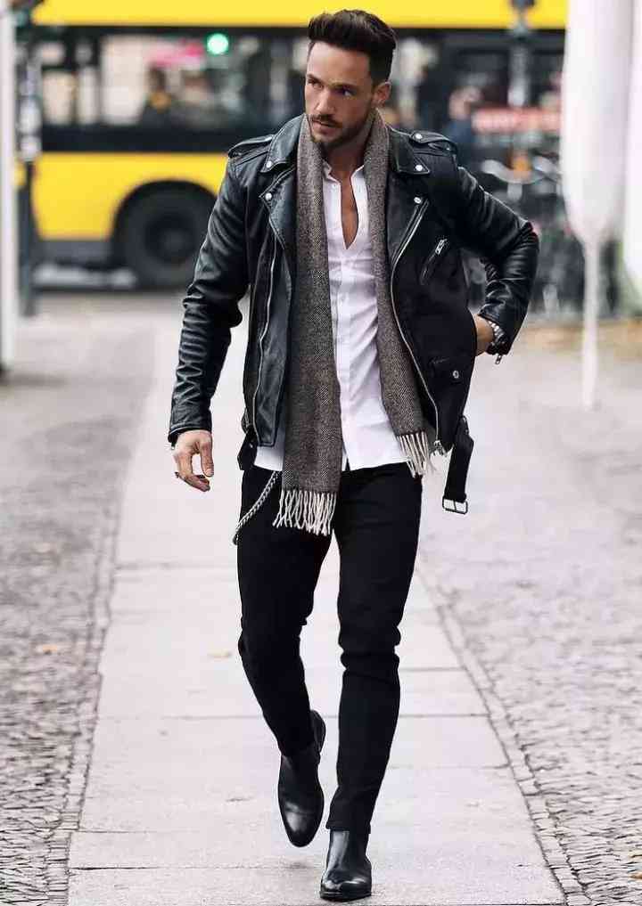 要数最时尚的围巾打法就一定是宽松三角巾,以毛毡材质的围巾搭配皮衣或夹克便能散发高街Syle感。