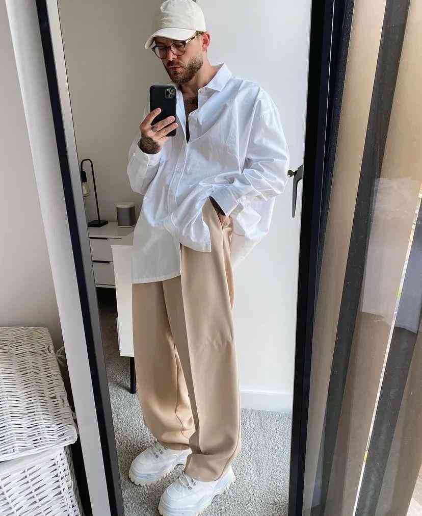 白衬衫主张简约,纸袋裤则更挑人,一般男生不敢轻易尝试。