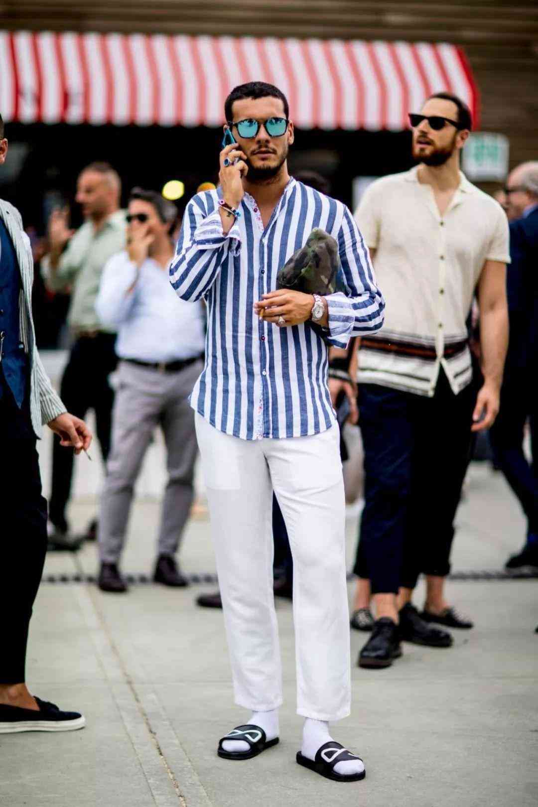 印花短袖衬衣内搭白色T恤,打造“内简外繁”的叠穿造型,下面选择一条白色休闲裤,纵向延伸视觉更显高。