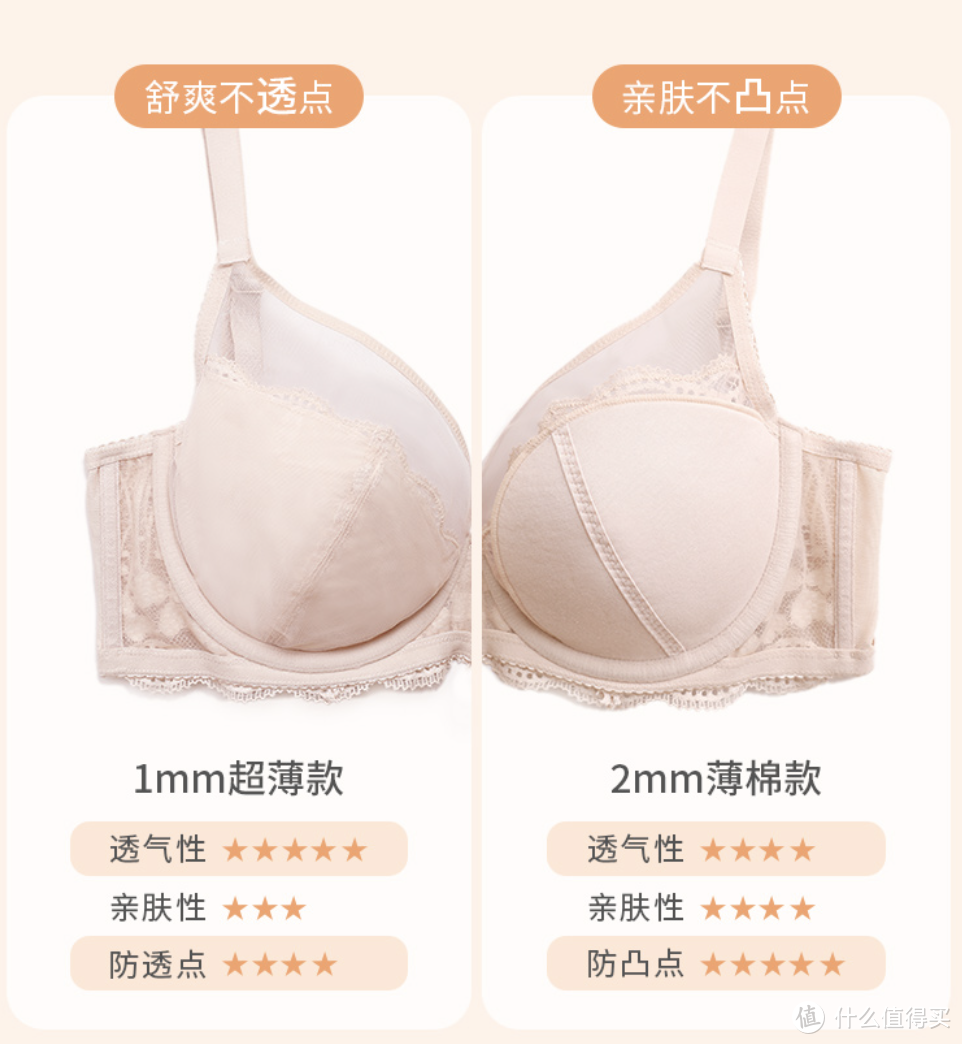 全罩杯设计,稳固承托,弧度减小,更适合亚洲女性,侧面轻薄自然,视觉显小。设计有1mm超薄款和2mm薄棉款,透气亲肤,防凸点。