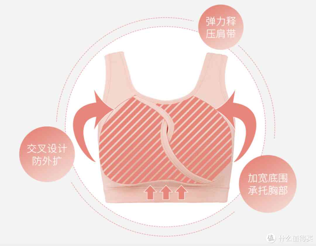 8字型交叉设计,稳固胸型,防止外扩,缓解压力。可拆卸圆形胸垫,软弹亲肤,采用莱卡面料,高弹亲肤,轻柔包裹,活动自如。宽肩带设计,缓解肩部压力,无压迫感。