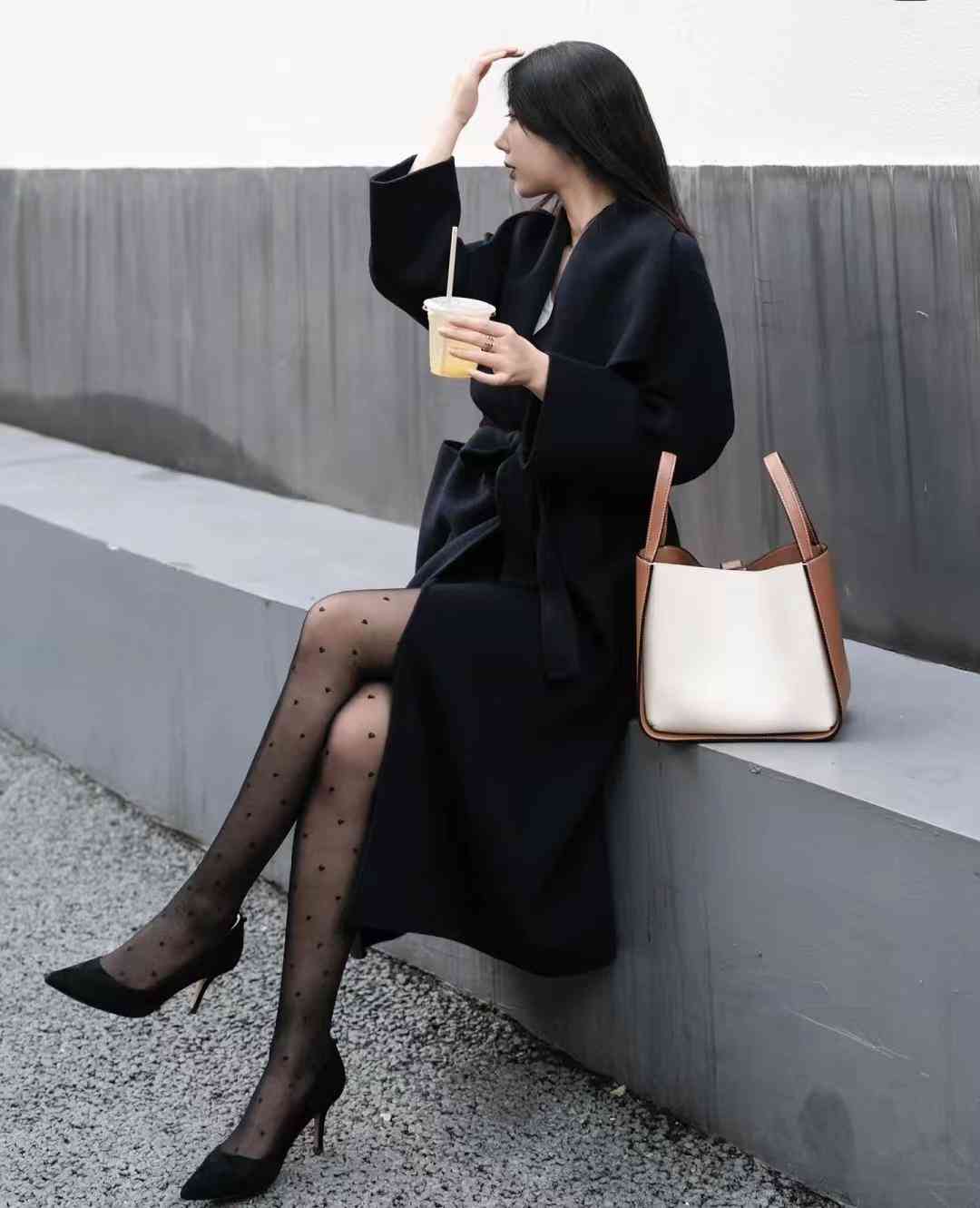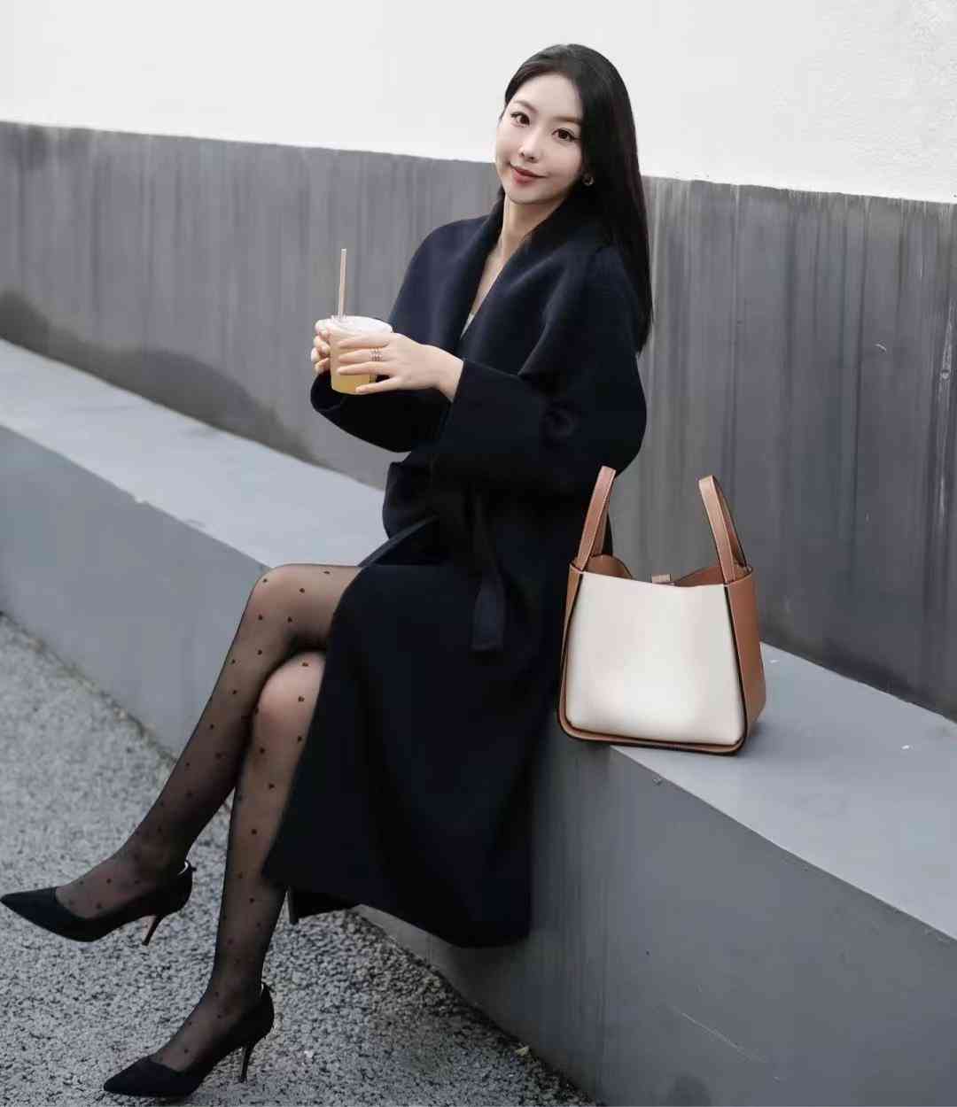 look1 藏青色大衣+波点丝袜/黑色高跟鞋