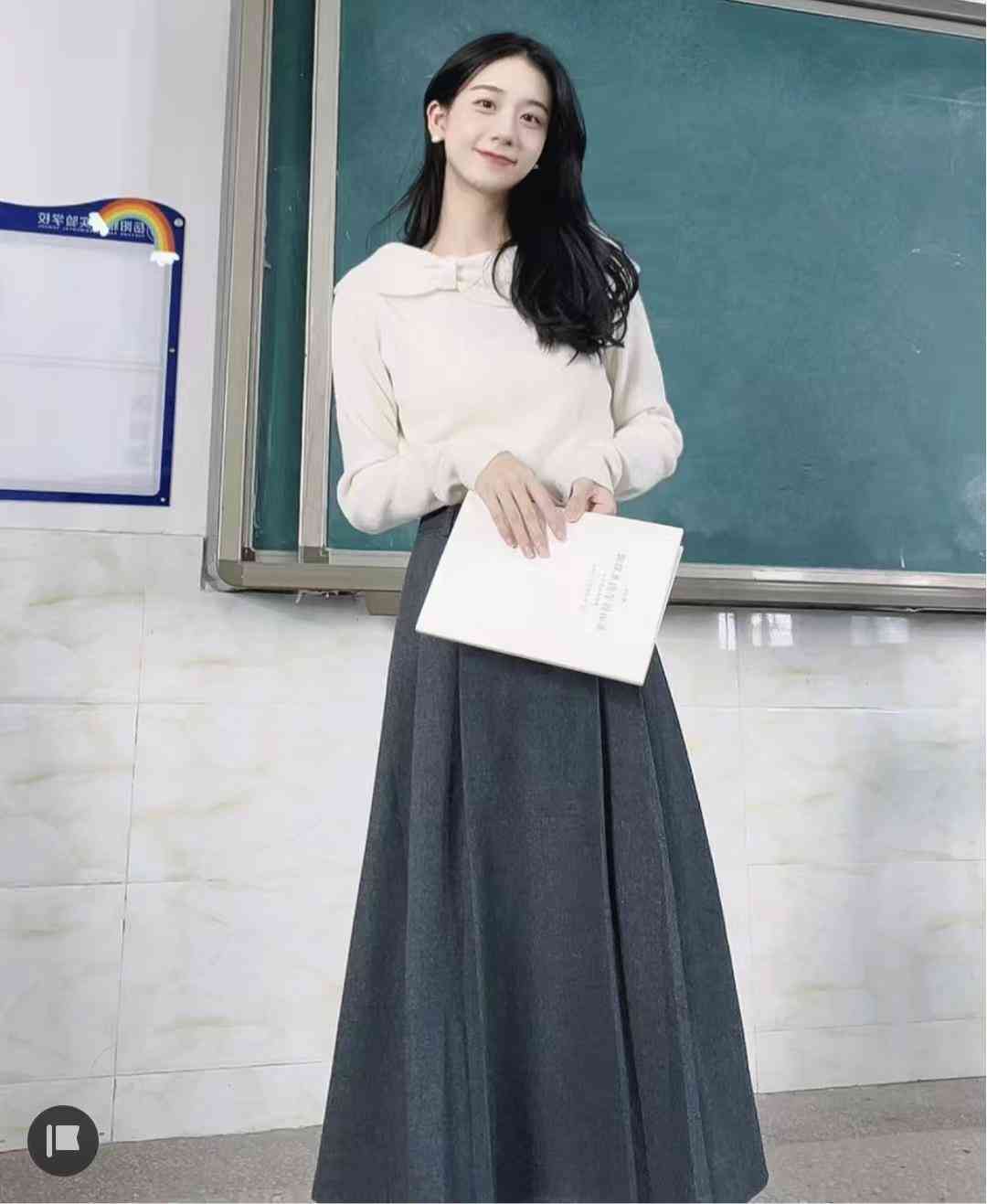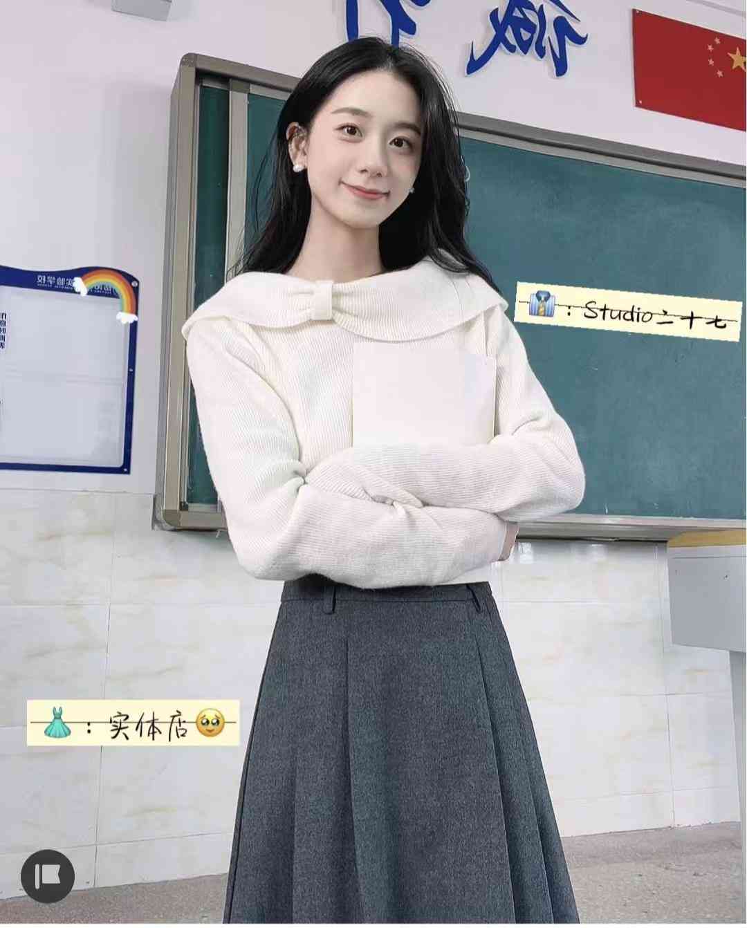 白毛衣真的自带打光版和滤镜,超显白很衬人了!一字领非常显气质,谁穿谁是冬季韩剧女主,而且设计很巧妙,完全不露!搭灰色百褶裙比较知性温柔,配牛仔裤肯定也好看的~