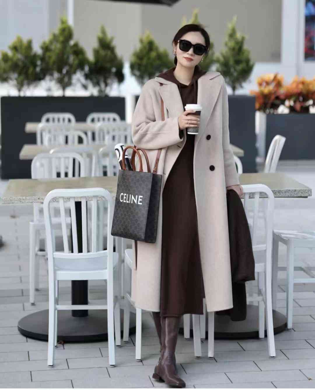 燕麦色大衣+棕色羊毛长裙,同色系深浅不一的叠穿凸显了层次感,又兼具了法式简约优雅的质感,加之长靴围巾等细节的点缀,高级时髦又不失温度的,毫不费力就可以轻松get~