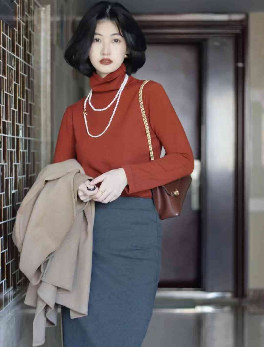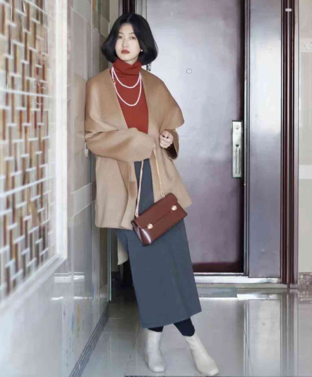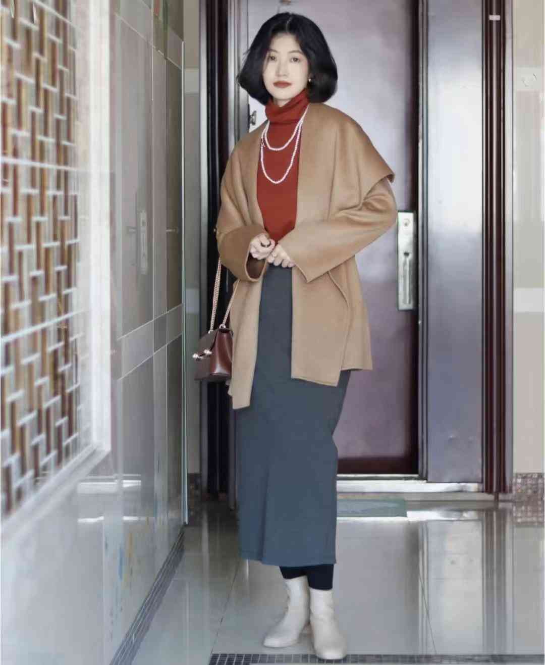 这身的look是纯色配搭,上装是简约的驼色大衣+高领打底衫,下装是灰色基本款半裙,一套对梨型身材太友好~