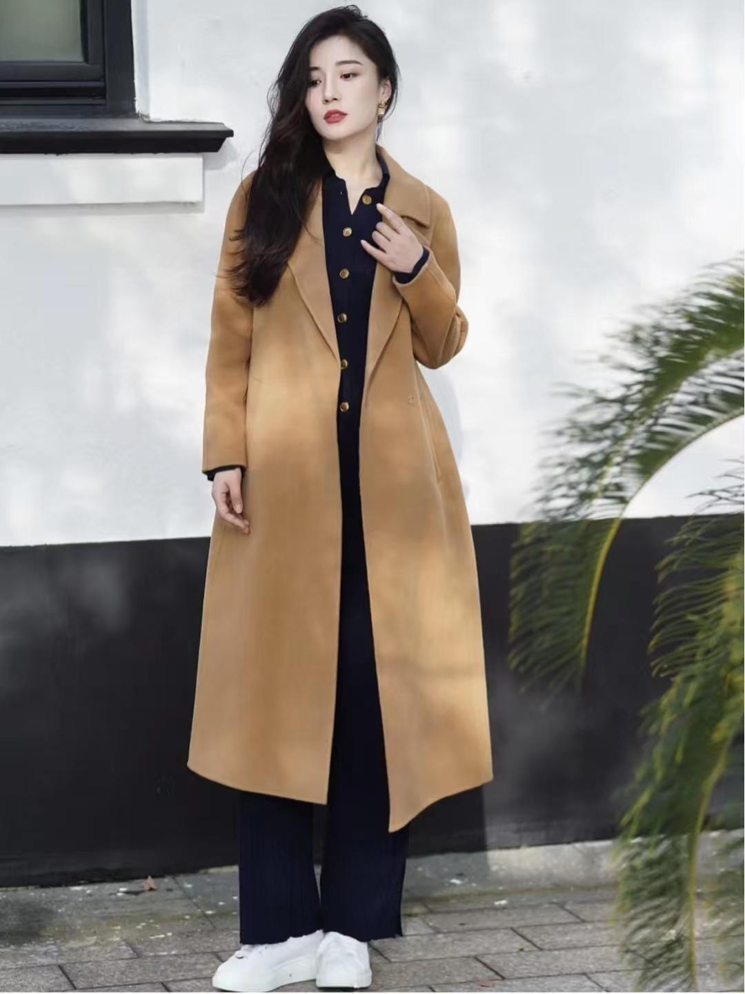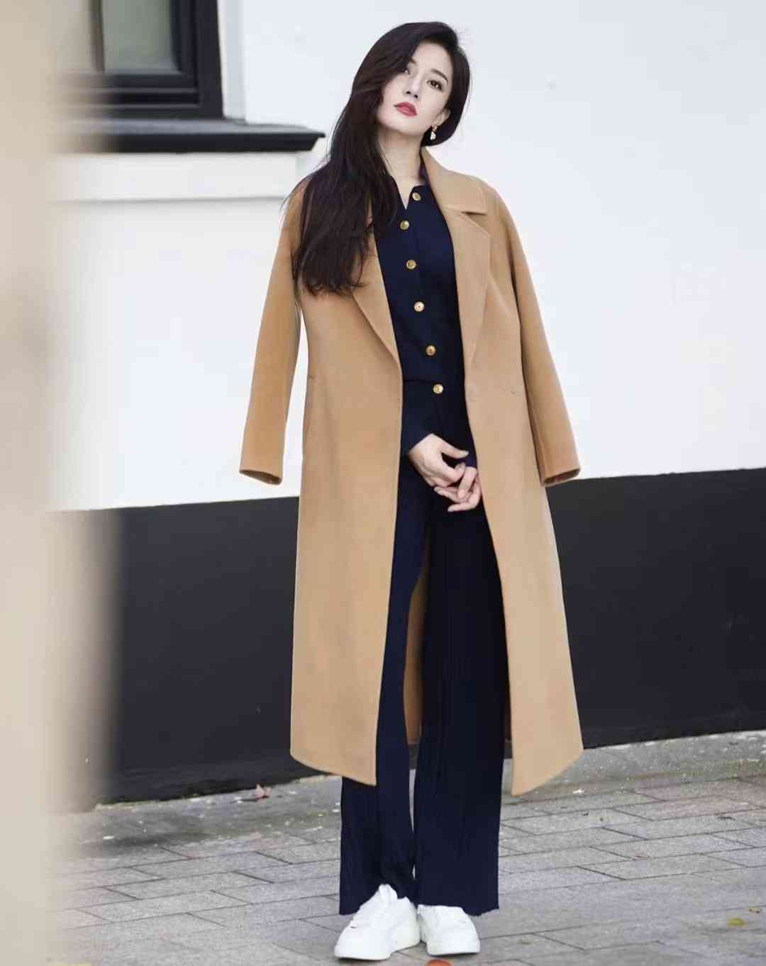 look6 驼色大衣+藏蓝色修身套装/小白鞋