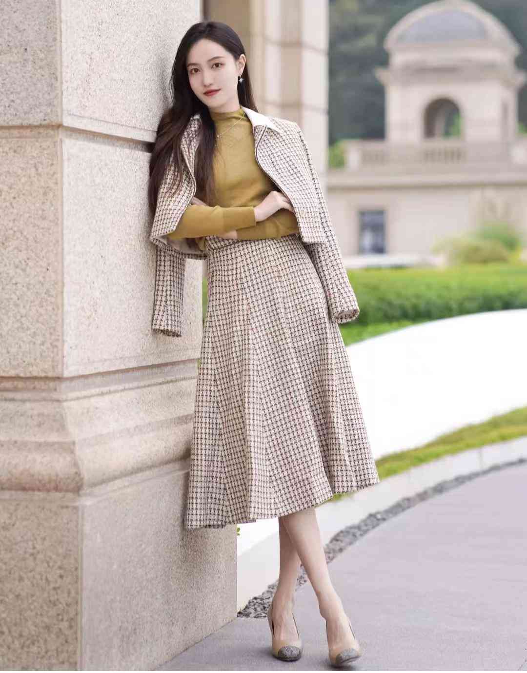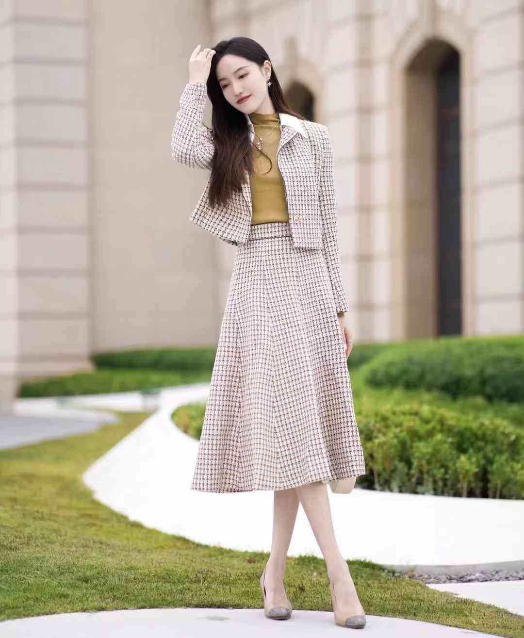 look7 格纹小香风套裙+高领打底/高跟鞋