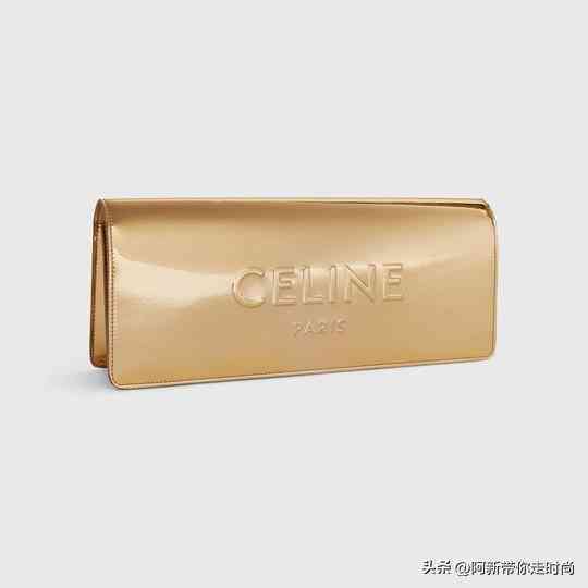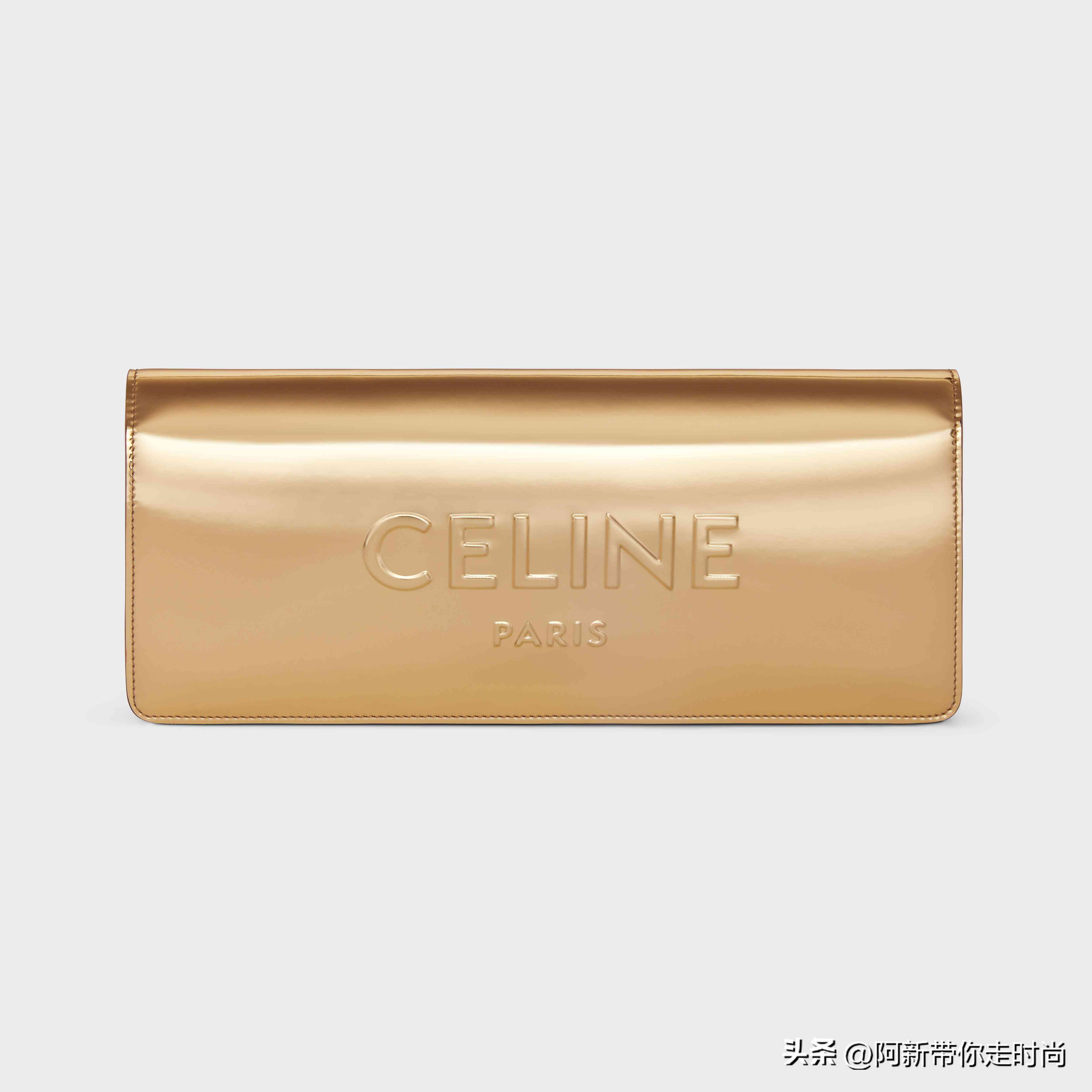 CELINE 本周上架一款金色手拿包,采用修长廓形和极简外观,金色层压织物面料呈现镜面般的光泽质地,并点缀「CELINE」压花徽标。这款手拿包让人联想到长条的巧克力盒,风格简洁而耀眼。