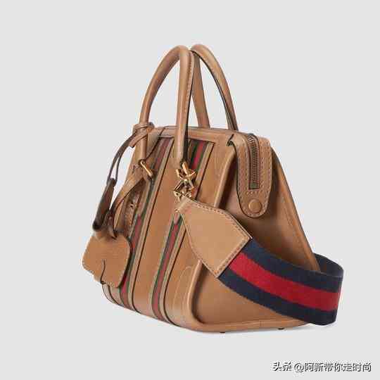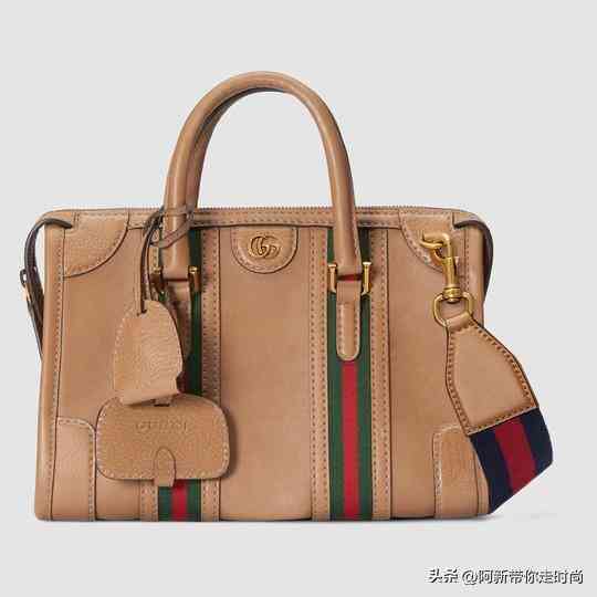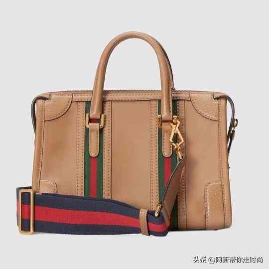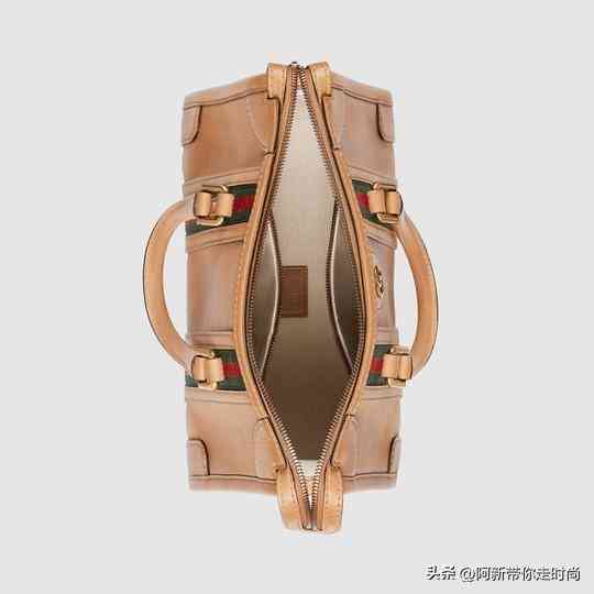 这款小号手提包出自2022秋冬「Exquisite Gucci」系列作品,设计灵感来自旅行箱。包包从正面看是矩形轮廓,侧面是立体三角造型,运用浅棕色皮革制作。亮点是包身纵贯2条红绿织带,像是复古旅行箱的绑带元素,与织物肩带相呼应。