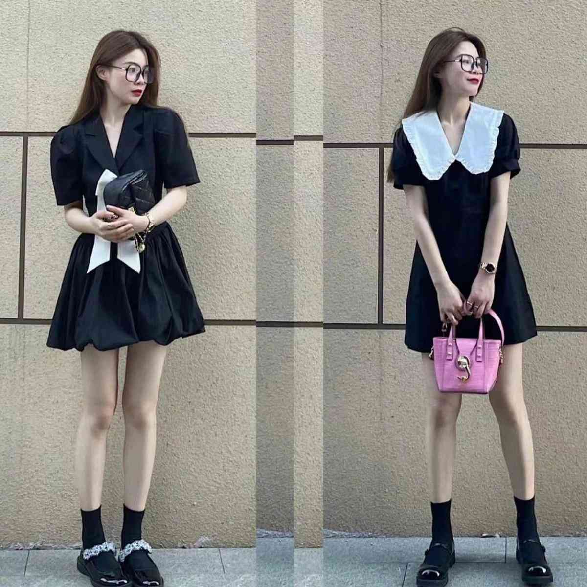 黑色的连衣裙看似简约普通,裙身收腰的设计,轻松穿出小蛮腰,也不显女生的小肚腩。白色的娃娃领有可爱甜美的花边纹路,大气淑女,一个粉色的包包让整个穿搭都变得格外出彩,与众不同了!