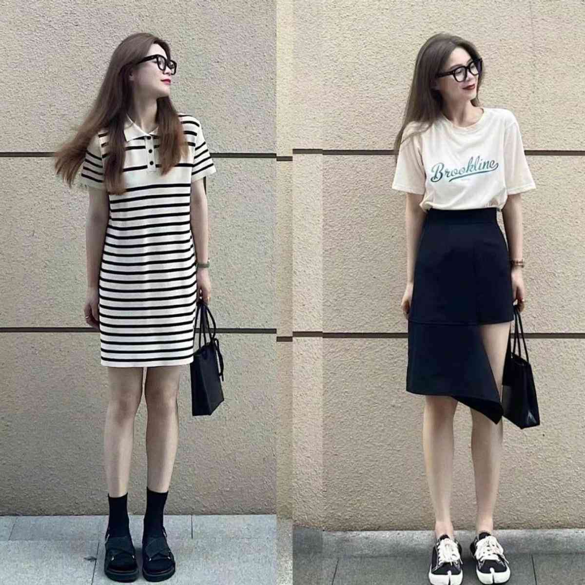 简简单单的款式,亦能够穿出最大方高级的模样。米白色的条纹T恤长裙,小个子女生可以完全当作一件连衣裙来搭配,高个子女生可以通过它穿出下半身失踪的感觉,尽显高级之美。