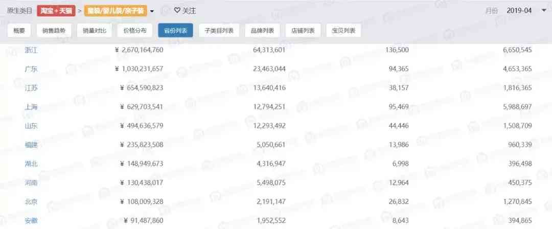 格局母婴研究院数据显示:在天猫+淘宝平台,童装类目下的各省份销售额排名有很明显的格局,浙江、广东、江苏是童装线上销售大省的事实显而易见,连续几个月排名前三位。浙江省基于纺织业的历史基础加上作为电商的发源地等优势,都让浙江省成为电商大省、童装大省。