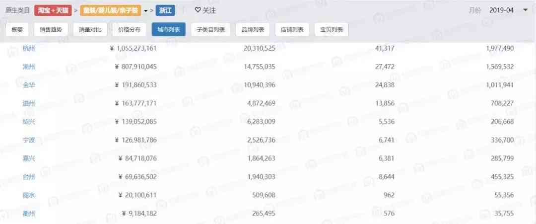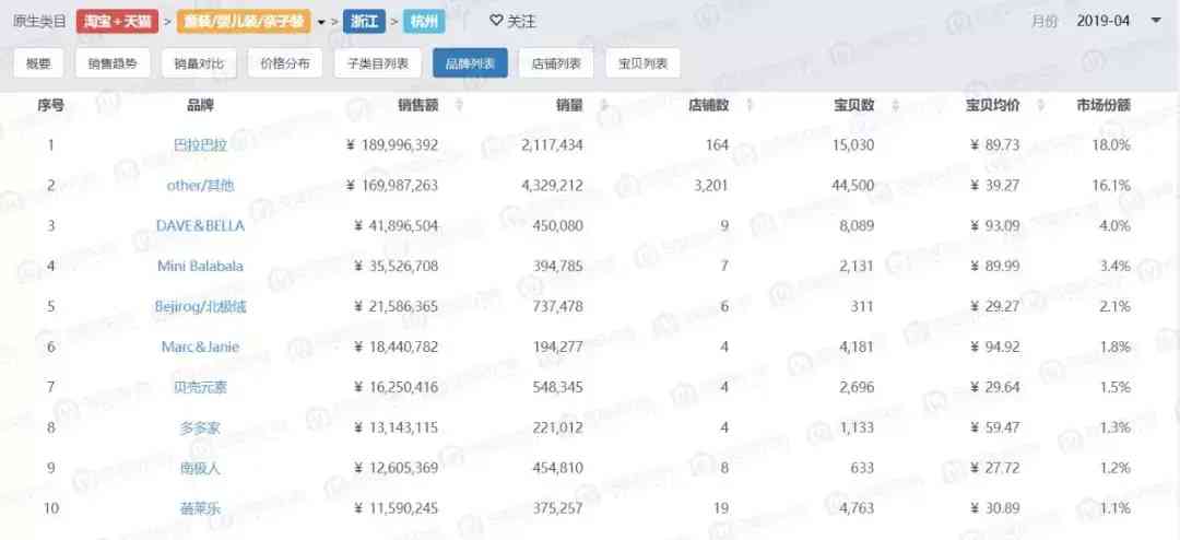 在杭州的线上店铺中的品牌列表,能够看到很多童装TOP30的品牌。.名的巴拉巴拉,总部位于杭州,2019年4月份一个月的销售额就达1.89亿。连续两年双十一仅次于巴拉巴拉的戴维贝拉同样发家于杭州,如今也算做得小有名气,在童装TOP30中可以排到第十名。其余的Mini Balabala、北极绒、马克珍妮你、多多家、南极人……都是目前做得比较好、品牌属性也比较强的品牌。所以在杭州的童装电商中,国产名品牌童装是比较聚集的。